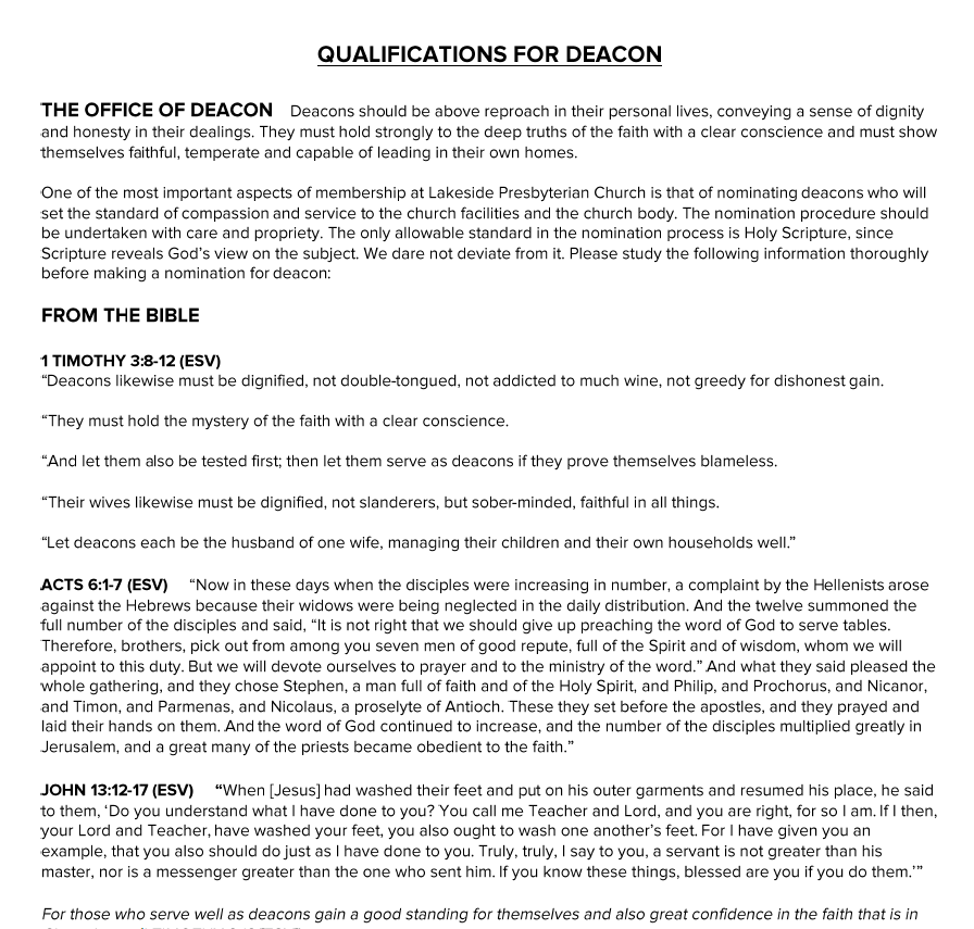 Nominating officers at Lakeside Presbyterian Church is a key responsibility of membership, as they provide spiritual leadership and care for the congregation. This process should be approached with care, guided solely by Holy Scripture.